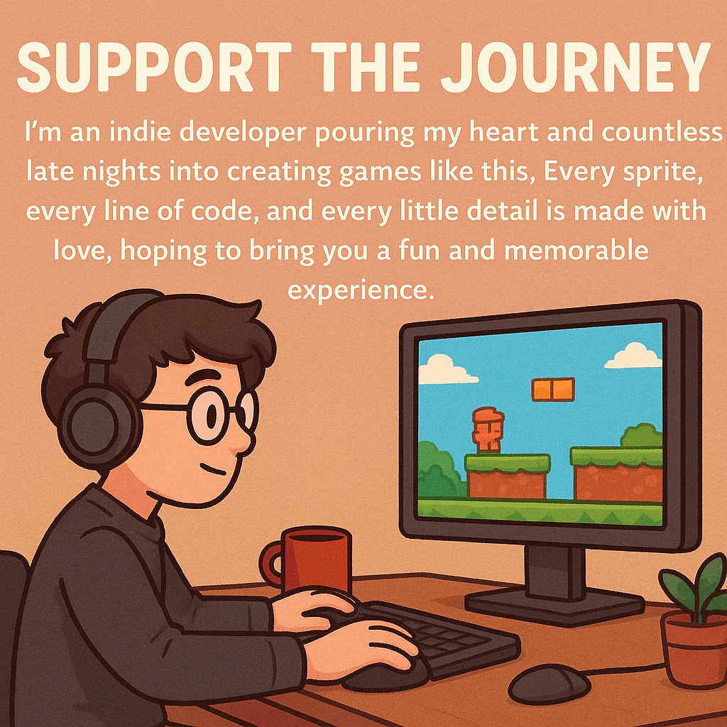 I’m an indie developer pouring my heart, time, and countless late nights into creating games like this. Every sprite, every line of code, and every little detail is made with love, hoping to bring you a fun and memorable experience.